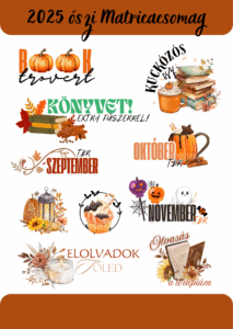 Könyvmoly termékek A KÖNYVMOLY termékek között megtalálhattok:TBR kártyákat, könyvjelzőket, matricákatAz oldal folyamatosan frissül!Hamarosan jönnek a mágneses könyvjelzők, új őszi matricacsomag! TBR sorsjegyek Ha nem tudod, hogy mi legyen a következő olvasmányod, akkor KAPARJ egyet! Kaparok! 2025 ŐSZ Mágneses könyvjelzők Megérkeztek a mágneses könyvjelzők!Fogadjátok sok szeretettel a 2025-ös év Őszi mágneses könyvjelzőit!SPOILER! Télen jönnek az újabbak!Őszi darabok:– Booktrovert– Kuckózós ősz– Itt nyugszik az utolsó olvasott oldal– Itt zavartak meg!– Olvass többet, görgess kevesebbet Őszi matricacsomag 2025 Megérkezett az 2025 őszi matricacsomag!A csomag a képen látható összes matricát tartalmazza! Őszi matricacsomag 2024 Nekem az egyik kedvenc évszakom az ősz és az ezzel járó kuckózás, gyönyörű színek, illatok.Szerettem volna nektek is átadni ezt az érzést. Remélem sikerült.Fogadjátok sok szeretettel az első őszi matricacsomagom! Karácsonyi matrica csomag - gyerekeknek Álmodtam egy Karácsonyt című mesekönyvem mellé kitűnő választás!1490 Ft Karácsonyi matrica csomag - könyvmolyoknak Természetesen a könyvmoly matricák sem maradhatnak el!1490 Ft #szabadirodalmat - matrica ív Mint író, és mint olvasó is, fontosnak tartom, hogy kiálljuk a mozgalom mellett!990 Ft Kávé és könyvek - matrica ív Te is szeretsz egy finom kávé társaságában olvasni? Akkor ez a matrica ív neked való!990 Ft Matrica - Lányok! Vár Álomország! 690 Ft Matrica - Mentős tematika 690 Ft Matrica – Fiúk! Vár Álomország! 690 Ft